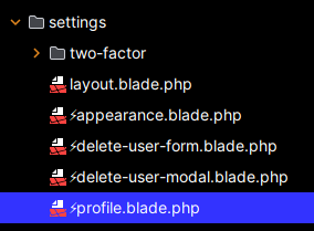 La page qui apparaît par défaut est celle des informations personnelles. Elle est gérée par ce composant Livewire :