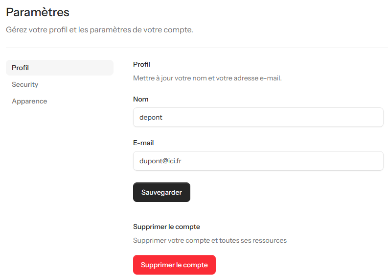 Là, on peut modifier le nom et l'email. On peut également supprimer son compte avec un bouton rouge bien voyant. Évidemment, il est prévu une confirmation pour éviter une action intempestive :