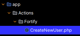 La validation et la création pour l’enregistrement sont présentes dans le fichier d'action CreateNewUser pour Fortify :
