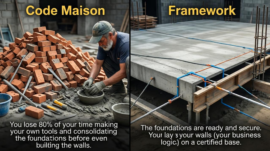 L'utilité d'un framework réside dans le gain de temps qu'il procure en évitant de réinventer la roue, c'est-à-dire de développer à nouveau ce qui a déjà été développé par d'autres, souvent plus compétents, et validé par de nombreux utilisateurs. Imaginez un framework comme une boîte à outils : si vous devez mettre en place du routage pour votre site, vous pouvez utiliser un composant éprouvé, ce qui vous fait gagner du temps tout en garantissant la fiabilité de votre application. De plus, vous bénéficiez de mises à jour régulières.