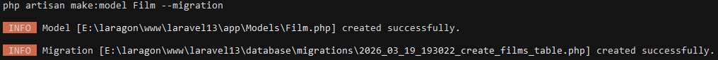 On va créer avec Artisan le modèle Film en même temps que la migration :