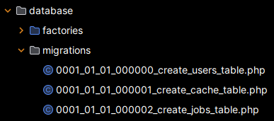 En examinant le dossier database/migrations, vous trouverez trois migrations déjà présentes :