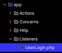 On va utiliser l'événement intégré à Laravel qui se déclenche lorsqu'un utilisateur se connecte. La classe correspondante est Illuminate\Auth\Events\Login. Puisque l'événement existe, on n'a pas à créer une classe Event. Par contre, il nous faut une écoute (Listener) :