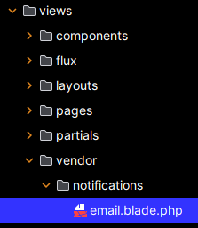 Vous la retrouvez alors dans le dossier resources/views/vendor/notifications :