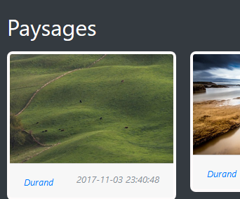 Pour l'affichage des vignettes de photos on va utiliser encore le composant card de Bootstrap 4 avec l'intéressante possibilité de les afficher automatiquement en colonnes sans effort ! Voilà le nouveau code de la vue views/home :@extends('layouts.app')
