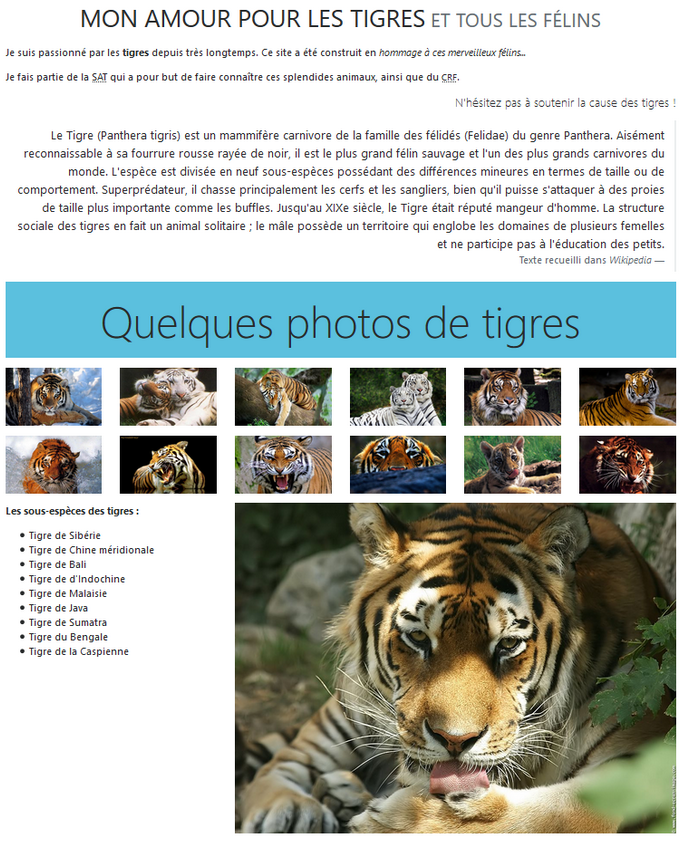 Je suis passionné par les <strong>tigres</strong> depuis très longtemps. Ce site a été construit en <em>hommage à ces merveilleux félins...</em>