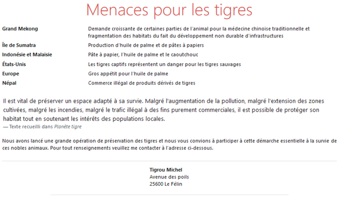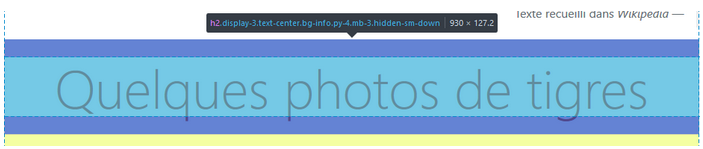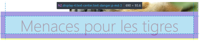 Regardez ce code dans la page d'exemple :<h2 class="display-4 text-center text-danger p-md-3">Menaces pour les tigres</h2>
