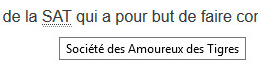 Je fais partie de la <abbr title="Société des Amoureux des Tigres">SAT</abbr> qui a pour but de faire connaître ces splendides animaux, ainsi que du <abbr title="Centre de Recherche sur les Félins" class="initialism">CRF</abbr>.