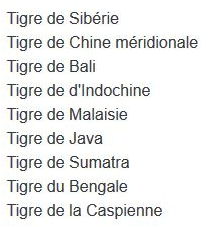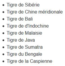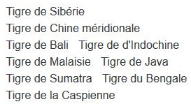 <p><strong>Sous-espèces des tigres :</strong></p>