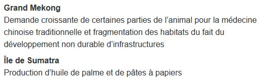 <dd class="col-md-9">Demande croissante de certaines parties de l’animal pour la médecine chinoise traditionnelle et fragmentation des habitats du fait du développement non durable d’infrastructures</dd>