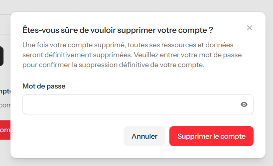 Là, on peut modifier le nom et l'email. On peut également supprimer son compte avec un bouton rouge bien voyant. Évidemment, il est prévu une confirmation pour éviter une action intempestive :