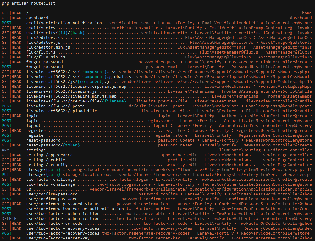 Utilisons php artisan route:list pour voir les routes ajoutées :