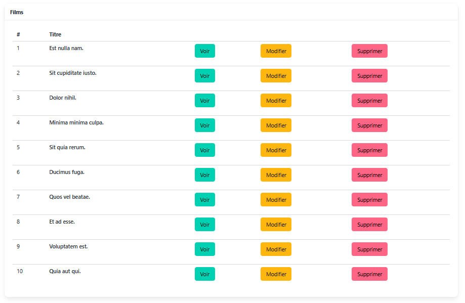 Dans ce chapitre, nous allons explorer les ressources nécessaires pour créer des routes "CRUD" (Create, Read, Update, Delete) adaptées à la persistance des données. Pour illustrer ces concepts de manière concrète, nous utiliserons l'exemple d'une table de films.