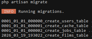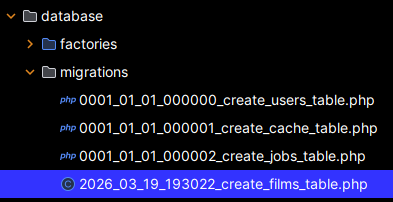 On a la création des tables de base de Laravel qu'on a déjà vues et qui ne nous intéressent pas pour cet article. Mais on voit aussi la création de la table films :