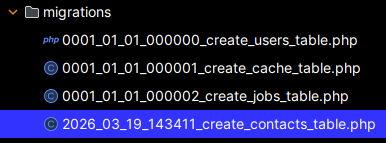 Le nom du fichier de migration commence par sa date de création, ce qui conditionne son positionnement dans la liste. L'élément important à prendre en compte est que l'ordre des migrations prend une grande importance lorsqu'on a des clés étrangères !
