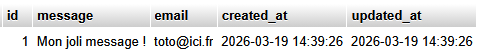 On crée une nouvelle instance du modèle, on renseigne ses propriétés et on finit avec un save pour l'enregistrer dans la base. Et si tout se passe bien on doit trouver l'enregistrement dans la table :