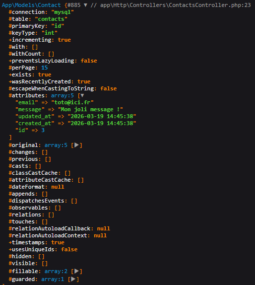 L'helper dd est bien pratique (il existe aussi l'helper ddd) il regroupe un var_dump et un die. Ici si on soumet le formulaire on va observer de plus près le modèle créé parce que la méthode create renvoie ce modèle :