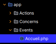 - des classes Event placées dans le dossier app/Events :