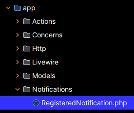Comme rien ne vaut un exemple, on va en réaliser un. On va à nouveau partir d'une installation vierge de Laravel avec le starter kit livewire. On décide d'envoyer un email à un utilisateur qui s'enregistre avec succès. On commence par créer la notification avec Artisan :