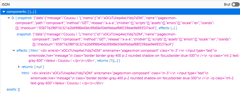 On peut remarquer qu'à chaque changement, on a une requête, il part une requête POST de la forme .../livewire-0902834d/update avec ce corps :