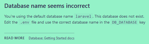 Avec la version 6 Laravel change de système d'affichage des erreurs et a fait le choix d'Ignition qui est bien plus élaboré que le précédent. Par exemple il nous informe que notre base de données est mal renseignée :
