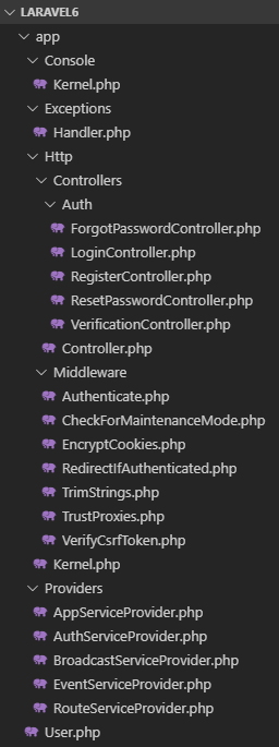 Maintenant qu’on a un Laravel tout neuf et qui fonctionne voyons un peu ce qu’il contient…Dossier app