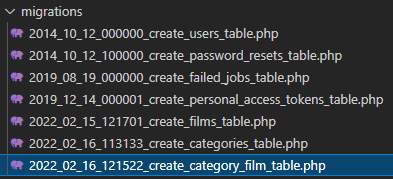 Et il nous faut en plus la migration pour la table pivot qui elle aura 2 clés étrangères : une pour les catégories et une autre pour les films :