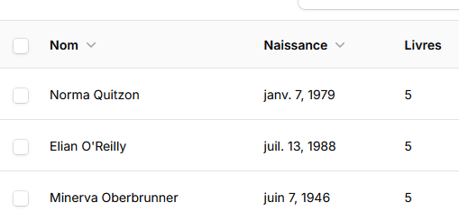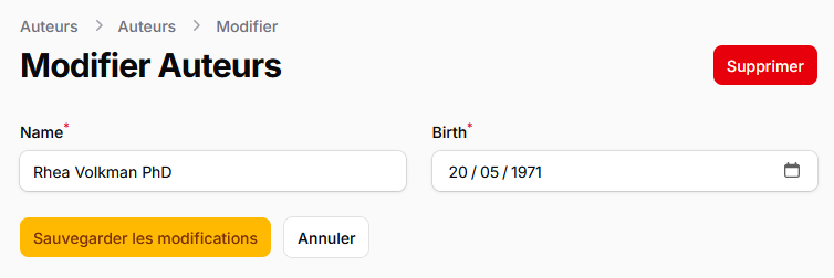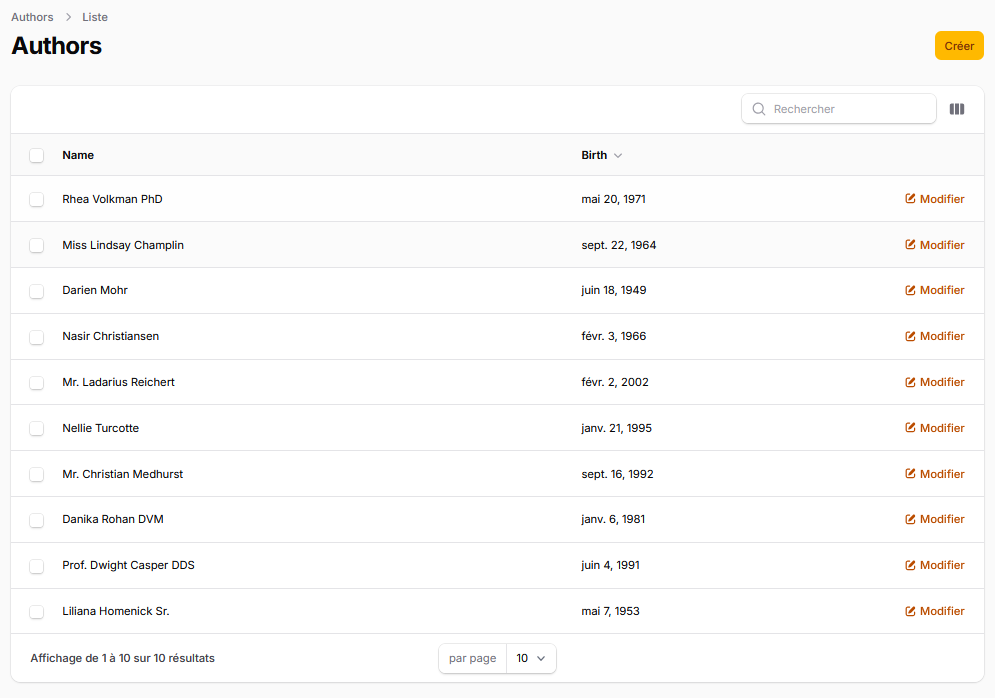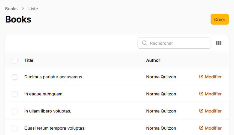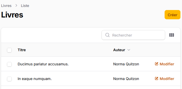 Filament utilise la notion de ressource définie comme un ensemble de classes statiques qui décrivent comment un administrateur interagit avec les données de la base. Globalement, on obtient une interface CRUD (Create, Read, Update et Delete). On va créer une ressource pour les auteurs :