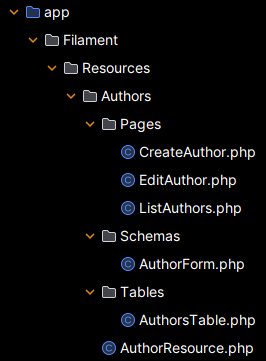La ressource proprement dite réside dans la classe AuthorResource. Cette classe permet de définir les tableaux, les formulaires, les autorisations, les pages, les autorisations, les actions....