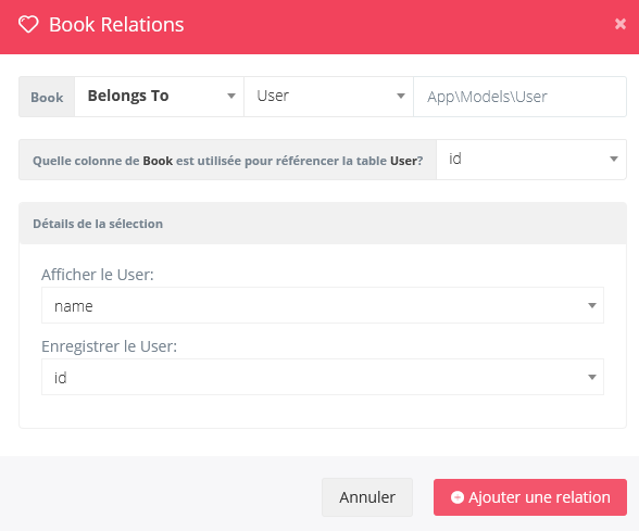 Pour la relation (relationship) on se réfère à l'id et on va afficher le name. Évidemment la relation doit exister dans le modèle :