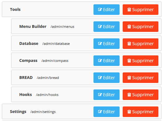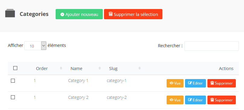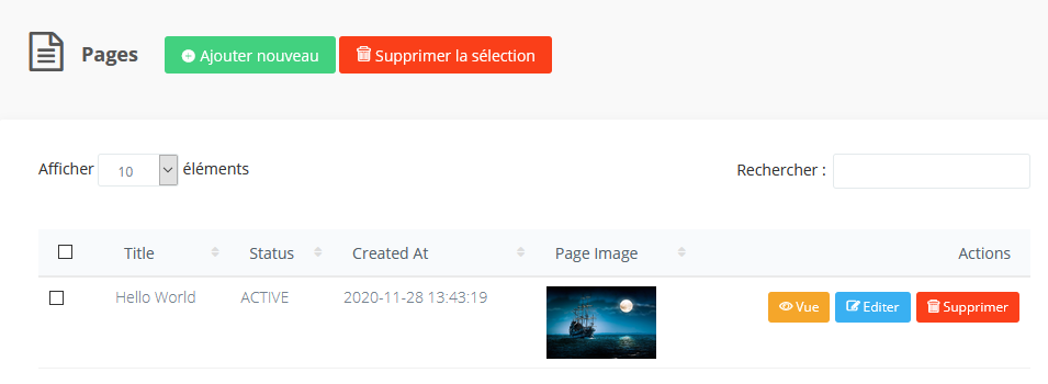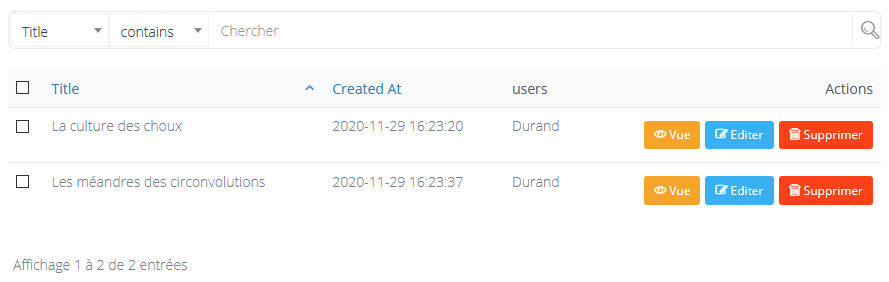 On a les actions classiques (voir, modifier, supprimer, créer un nouveau).