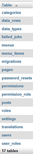 C'est Voyager qui se charge de la création des tables dans la base, on n'a pas à se préoccuper des migrations. On dénombre 17 tables créées :