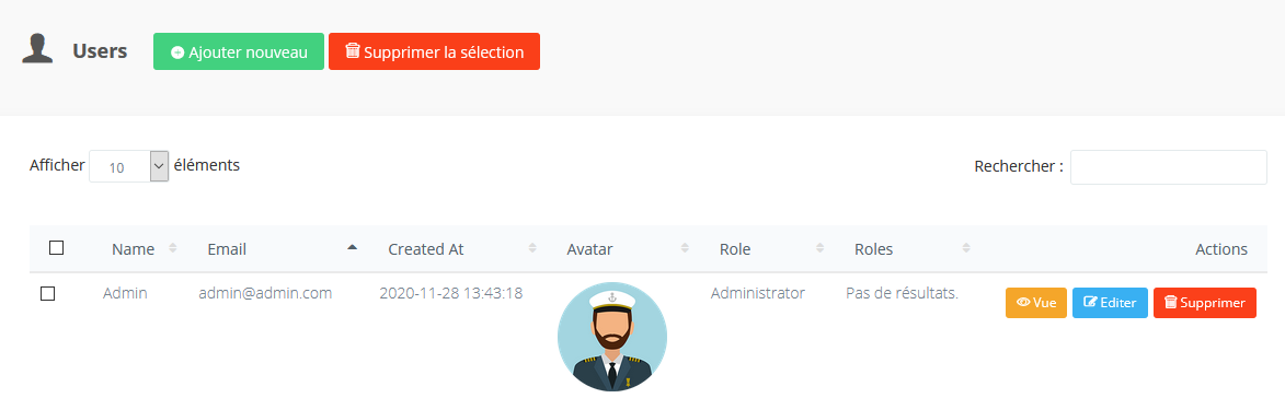 On peut aussi gérer les utilisateurs :On n'a que l'administrateur au départ. On retrouve toutes les actions classiques à ce niveau également. On peut remarquer la gestion de l'avatar.