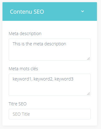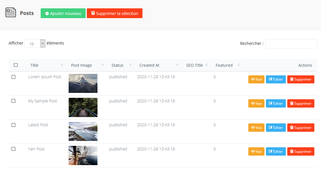 Moins de colonnes que les articles : titre, corps, résumé, slug, metas, statut (actif ou non) et image.