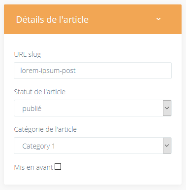 En mode création ou édition, en plus des classiques titres et contenu, on peut agir sur les détails de l'article :