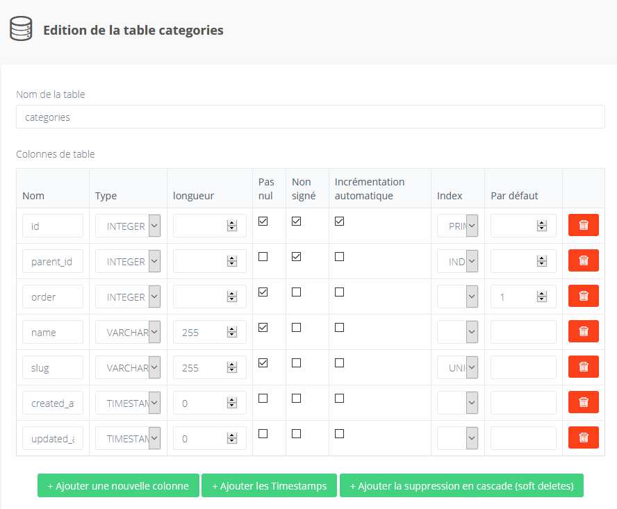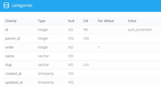 Un exemple avec une relation dans la table des catégories pour la colonne parent_id :